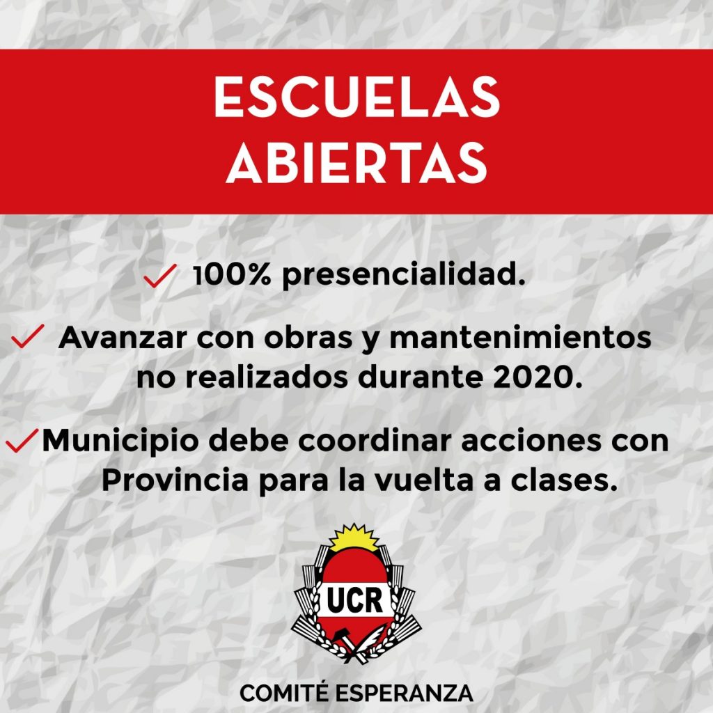En este sentido, el pedido formal de la UCR Esperanza, tiene que ver con una adecuada coordinación de tareas, entre Municipio y Provincia, para que la educación en la ciudad, vuelva a ser 100% presencial, implementando los protocolos necesarios para estas situaciones.
