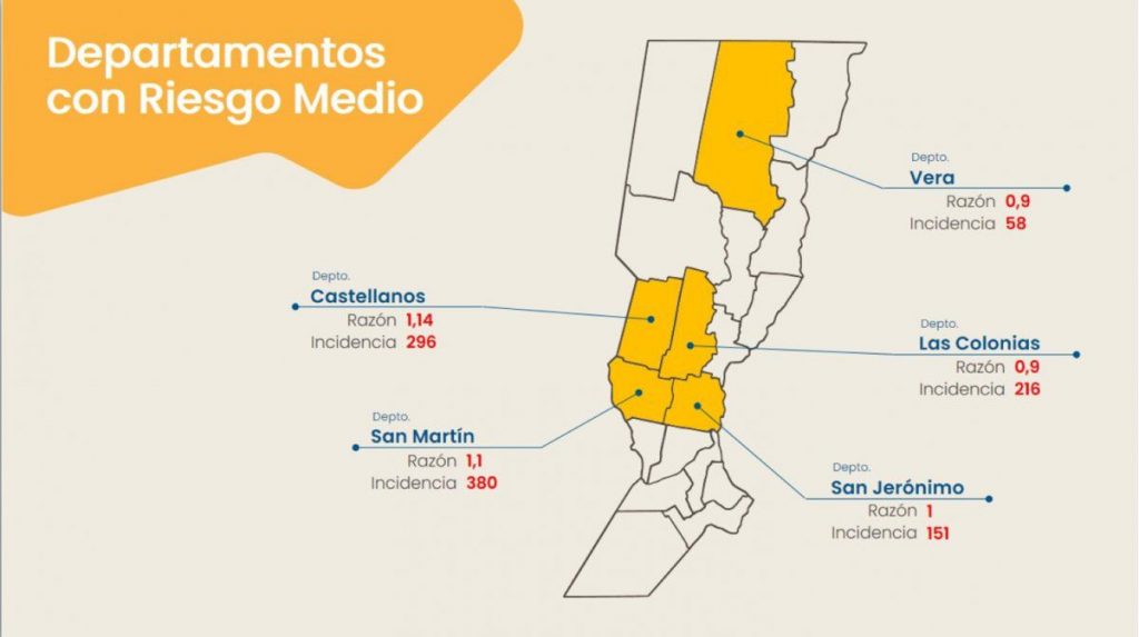 En zona amarilla -riesgo medio-, donde sólo hay un indicador elevado, Nación incluye a los siguientes departamentos santafesinos: La Capital, Constitución, General López, General Obligado, Iriondo, La Capital, San Cristóbal, San Jerónimo, San Justo y San Martín; pero según el monitoreo provincial actualizado a la fecha, a estos se suman Vera y Las Colonias, quedando en este rango también San Martín, San Jerónimo y Castellanos.
