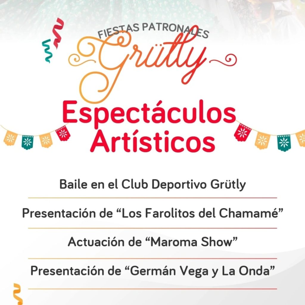 Ya en horas de la noche, la celebración se traslada al Club Deportivo Grütly, donde se presentarán “Los Farolitos del Chamamé”, “Maroma Show” y “Germán Vega y la Onda”.