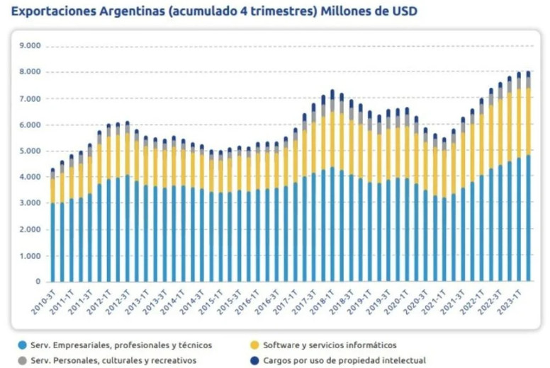 El valor de las exportaciones anuales del sector fue de US$8.104 millones en 2023, creciendo 2,9% interanual. La balanza sigue siendo positiva en US$384 millones, aunque en el cálculo de las importaciones “se suman todas las compras de servicios del conjunto de la economía, no solo las propias de las industrias del conocimiento. Esto hace que la comparación entre exportaciones e importaciones no refleje con propiedad el verdadero aporte de la economía del conocimiento a la balanza de pagos nacional”.