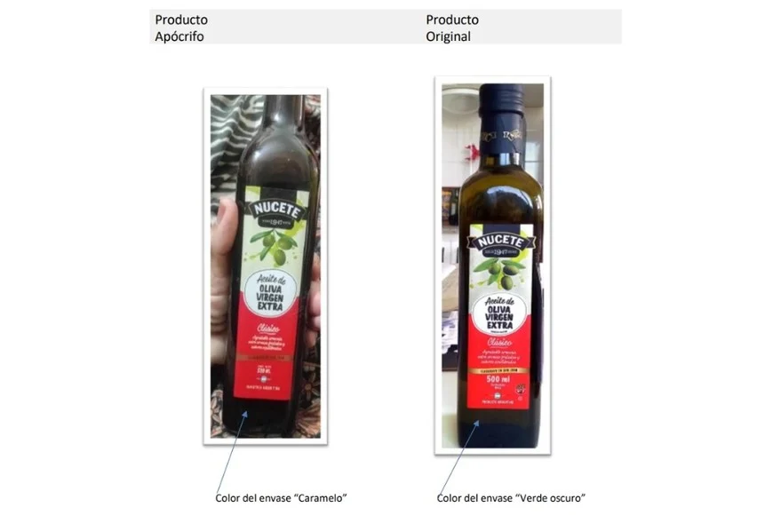 El legítimo elaborador confirmó que el producto investigado no fue fabricado por la compañía, que desconoce su procedencia y contenido. Además, enumeró diferencias visibles respecto del aceite genuino, lo que permitió avanzar en la investigación y activar los sistemas de vigilancia alimentaria.