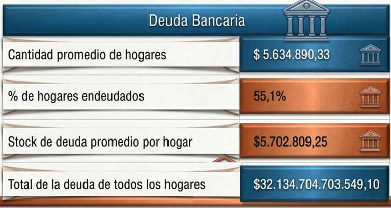 Los hogares argentinos acumulan hoy más de $39 billones en deuda: $32,1 billones en deuda bancaria y $6,9 billones en deuda no bancaria. La diferencia en los montos promedio por hogar es elocuente: mientras la deuda bancaria promedia $5.702.809 por hogar endeudado, la no bancaria se ubica en $1.149.431.