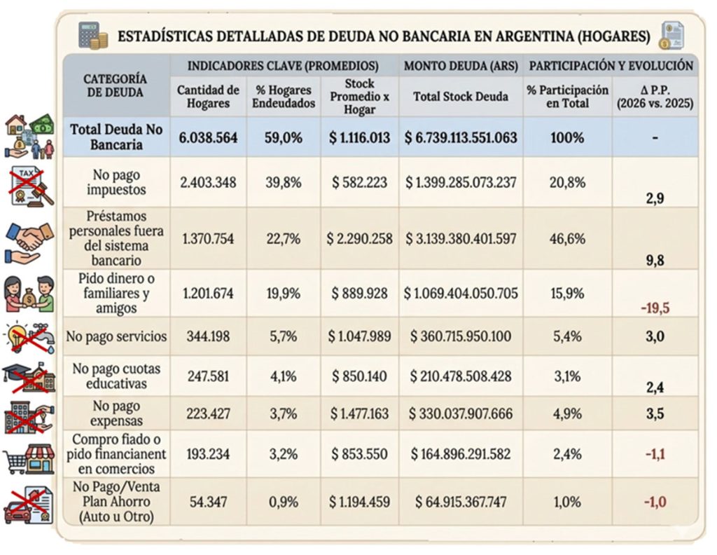 La deuda no bancaria agrupa realidades muy distintas: desde el préstamo de un familiar hasta la cuota del colegio impaga, pasando por impuestos atrasados, expensas sin abonar o financiamiento en el almacén del barrio. Al inicio de 2026, esta categoría involucra a 6.038.564 hogares -el 59% del total- con un stock promedio de $1.116.013 por hogar y un total acumulado de $6,7 billones.
