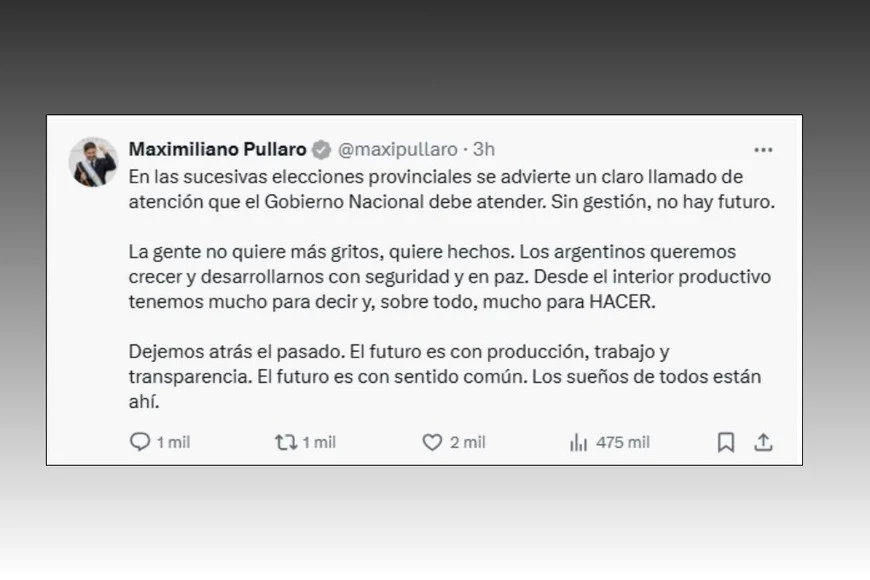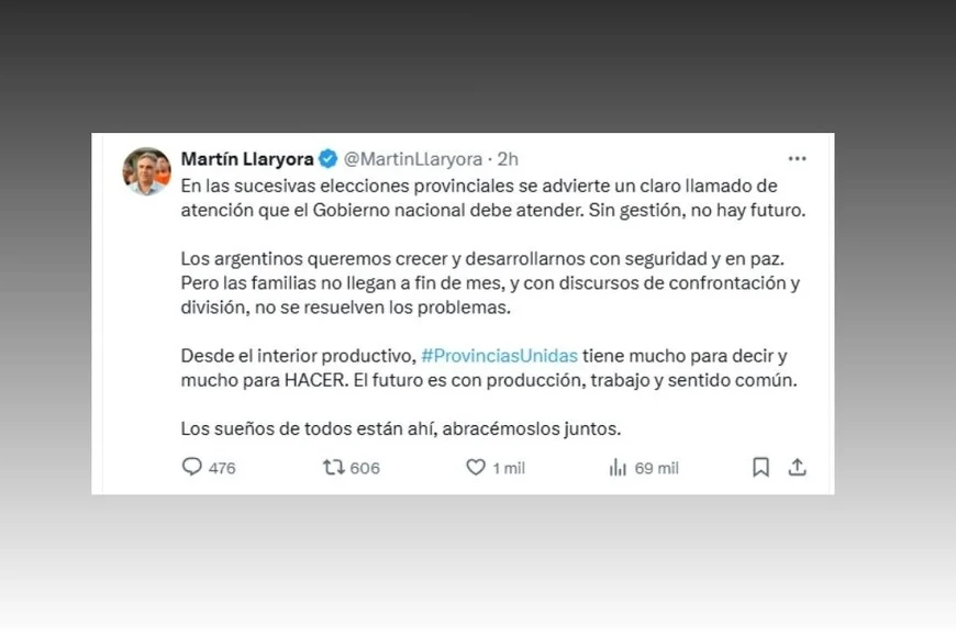 En la misma línea, Llaryora y Vidal compartieron un mensaje similar en X, destacando la necesidad de que el Gobierno nacional atienda las demandas de la ciudadanía: “En las sucesivas elecciones provinciales se advierte un llamado de atención. Sin gestión, no hay futuro”.