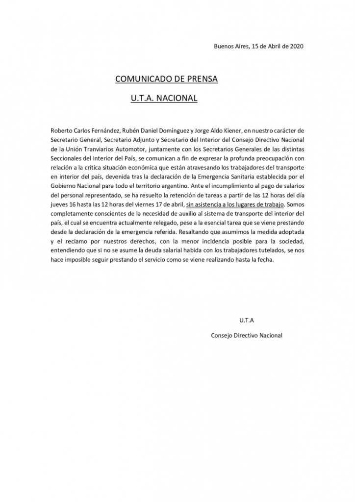 Mediante un comunicado, el gremio expresó “la profunda preocupación con relación a la crítica situación económica que están atravesando los trabajadores del transporte en el interior del país, devenida tras la declaración de la Emergencia Sanitaria establecida por el Gobierno nacional”.